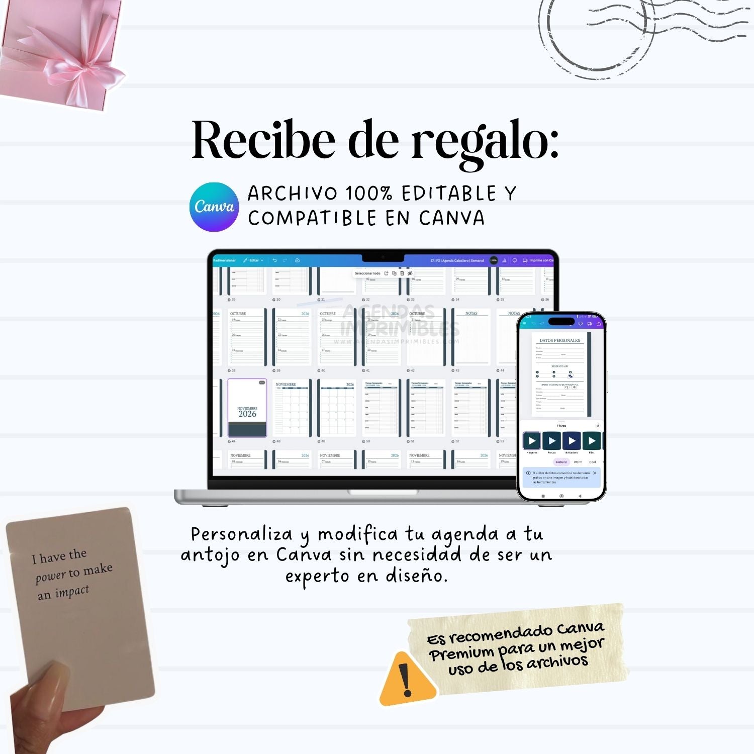 Puedes editarla desde la app de Canva y visualizar el PDF desde cualquier dispositivo, aunque se recomienda una pantalla más grande para editar cómodamente. Es importante aclarte que esta agenda esta diseñada para imprimirse no tanto para ser usada en programas digitales como Notion