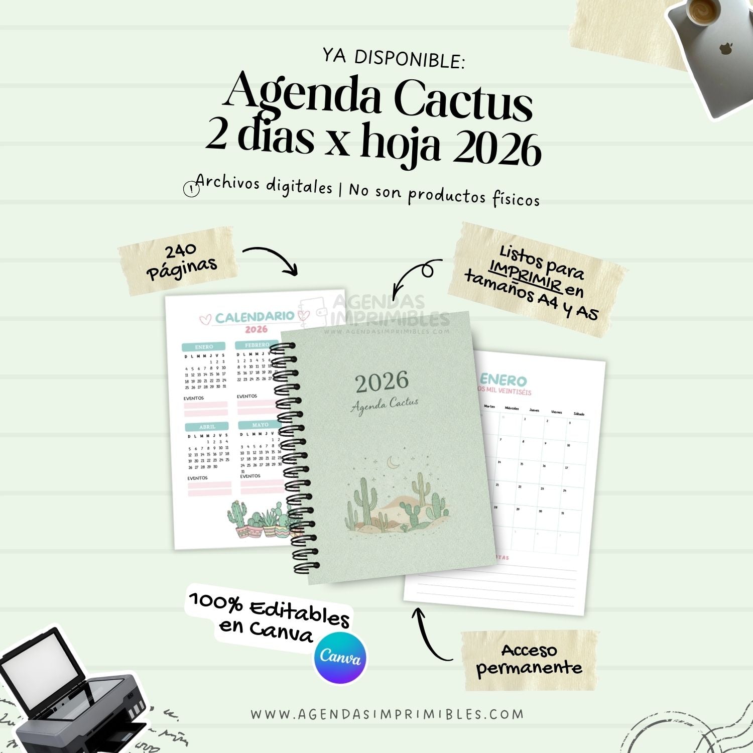 Planifica un año lleno de crecimiento con la Agenda Cactus 2026, una herramienta diseñada para ofrecerte claridad y orden en cada paso. Este diseño destaca entre nuestras agendas imprimibles por su práctico formato de 2 días por página, que te brinda el espacio ideal para gestionar prioridades, notas y tareas sin saturar tu vista. Al ser una de nuestras agendas editables en Canva, tienes la flexibilidad total de personalizar cada sección según tus necesidades o simplemente usar los archivos PDF listos para impresión en tamaños A4 y A5. Con 240 páginas que incluyen desde rastreadores de hábitos hasta metas anuales, esta agenda para imprimir te garantiza una organización profesional con un toque estético único y acceso permanente a tus archivos.