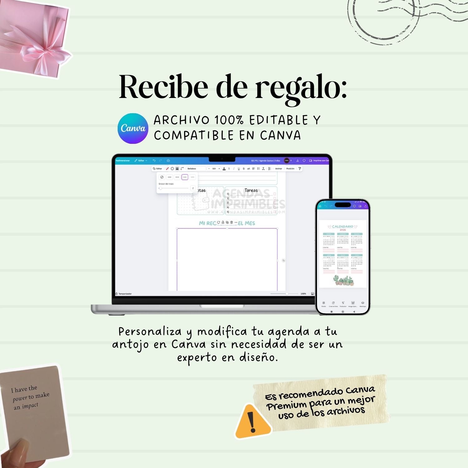 Personaliza tu agenda como más te guste: cambia textos, colores o secciones. ¡No necesitas ser experta en diseño!