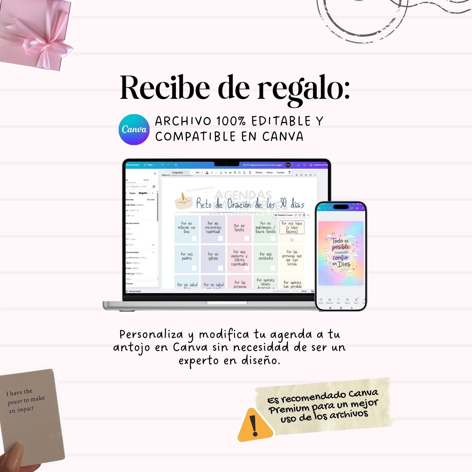 Personaliza tu agenda como más te guste: cambia textos, colores o secciones. ¡No necesitas ser experta en diseño!