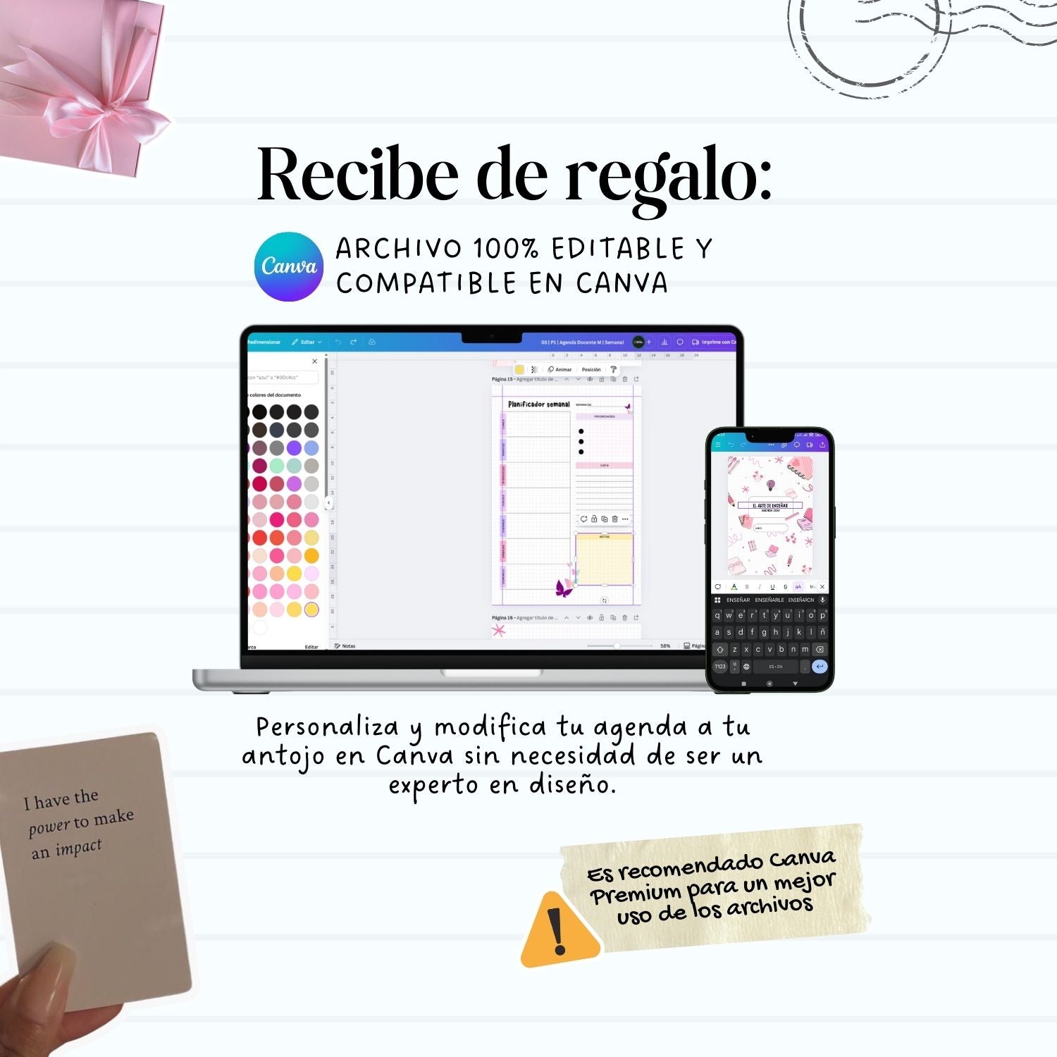 Personaliza tu agenda como más te guste: cambia textos, colores o secciones. ¡No necesitas ser experta en diseño!