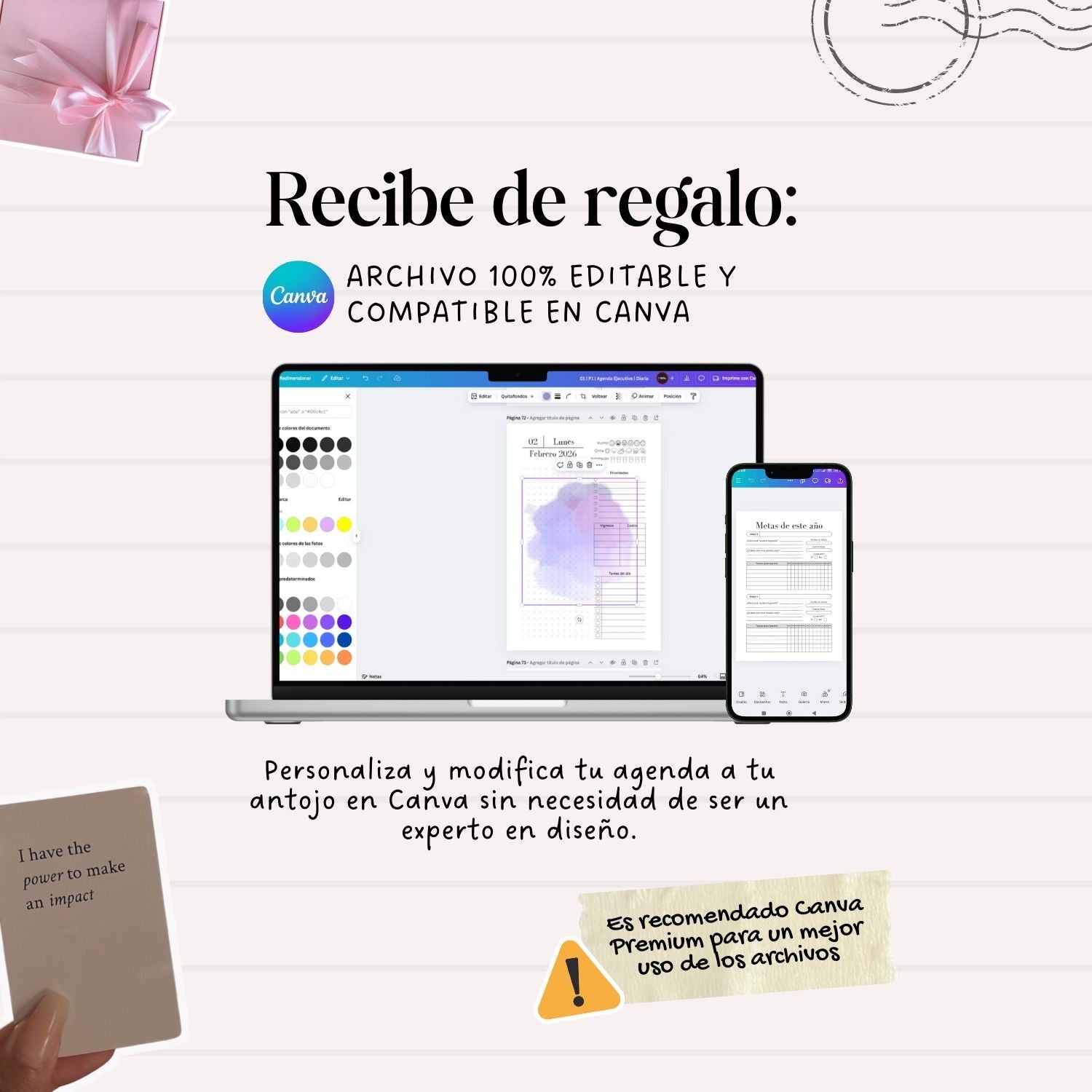 Personaliza tu agenda como más te guste: cambia textos, colores o secciones. ¡No necesitas ser experta en diseño!
