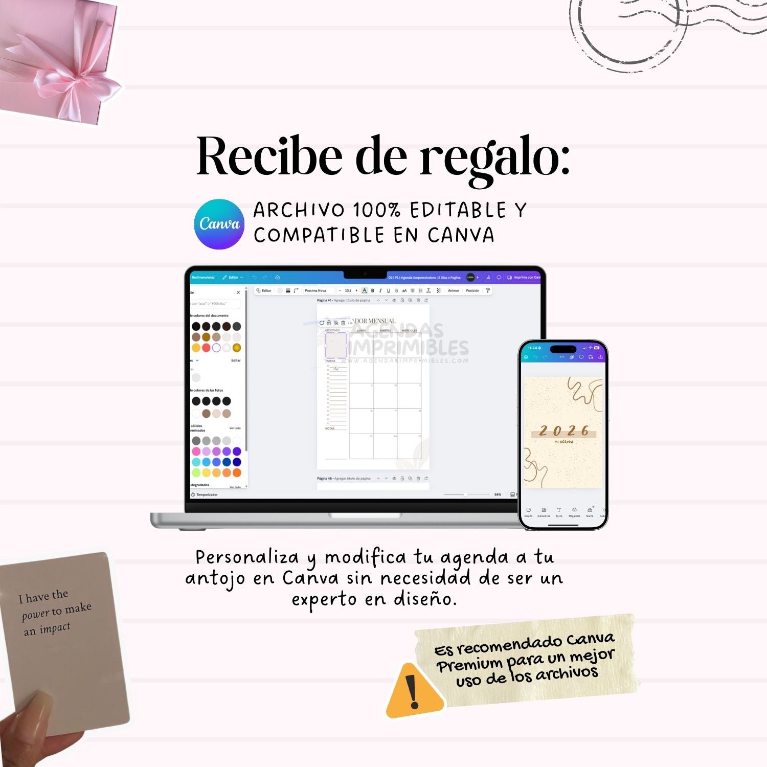Personaliza tu agenda como más te guste: cambia textos, colores o secciones. ¡No necesitas ser experta en diseño!