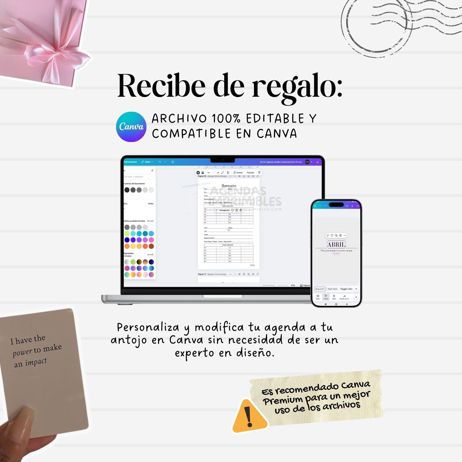 Si. La mayoría de las agendas incluyen una plantilla editable en Canva que funciona mejor con la versión de paga de Canva.