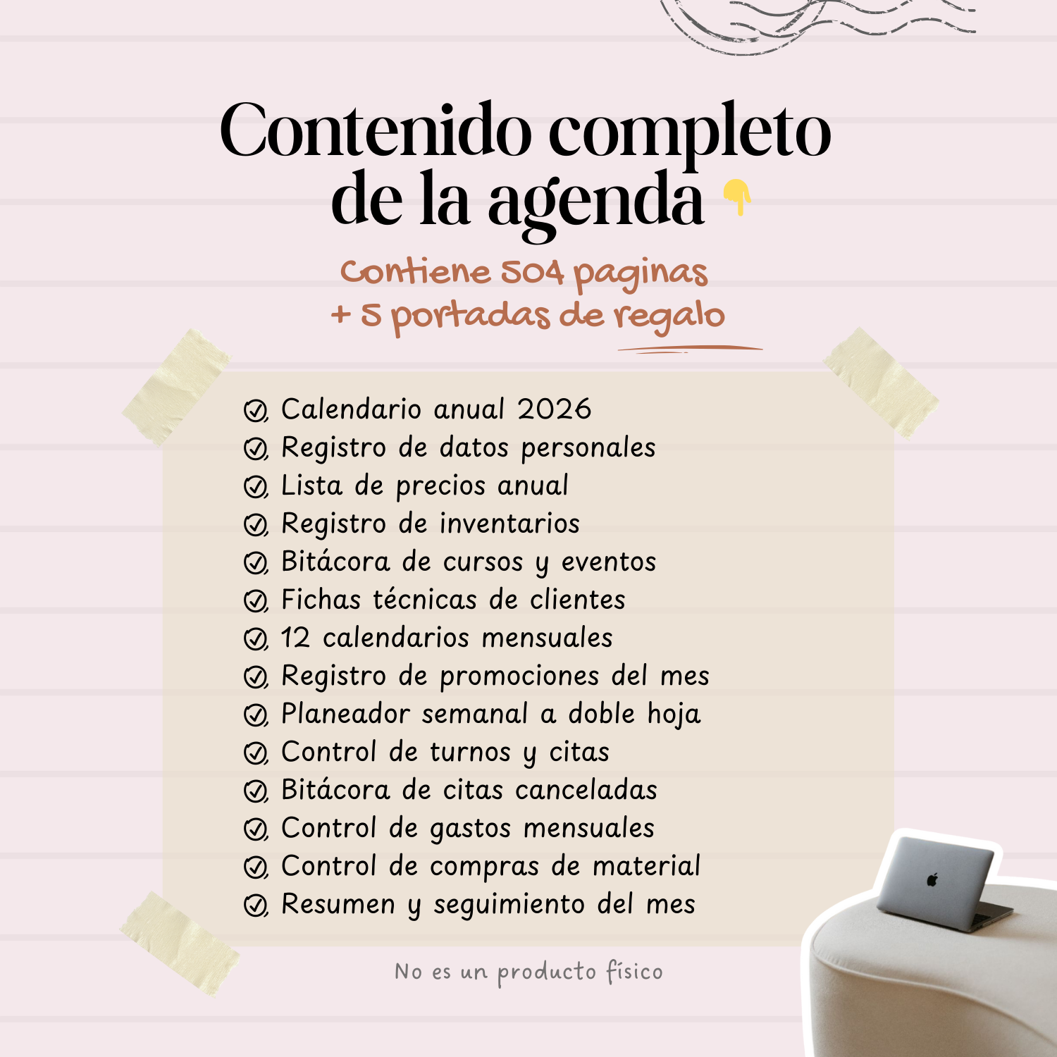 La Agenda Manicurista Semanal 2026 está diseñada especialmente para organizar tu trabajo, clientes y finanzas como profesional de uñas. 100% editable en Canva y lista para imprimir en PDF (formatos A4 y A5). Incluye calendario 2026, planeador semanal, control de turnos y citas, fichas técnicas de clientes, registro de inventarios, precios, gastos y promociones, además de frases motivacionales y secciones especiales para tu negocio. Con 252 hojas (504 páginas) en español y 5 portadas de regalo.