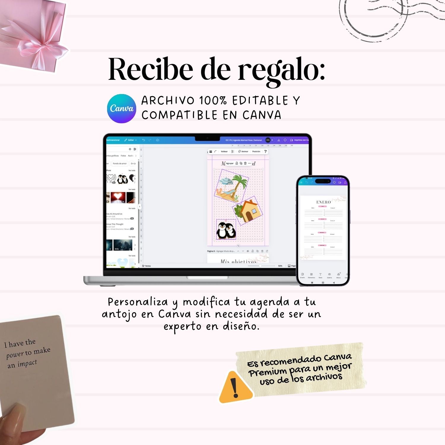 Personaliza tu agenda como más te guste: cambia textos, colores o secciones. ¡No necesitas ser experta en diseño!