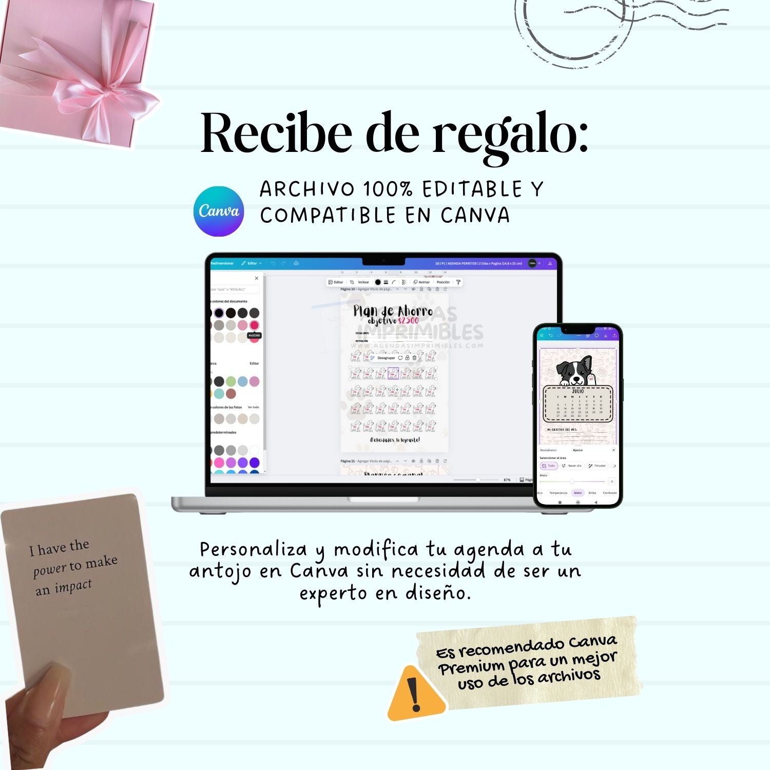 Personaliza tu agenda como más te guste: cambia textos, colores o secciones. ¡No necesitas ser experta en diseño!