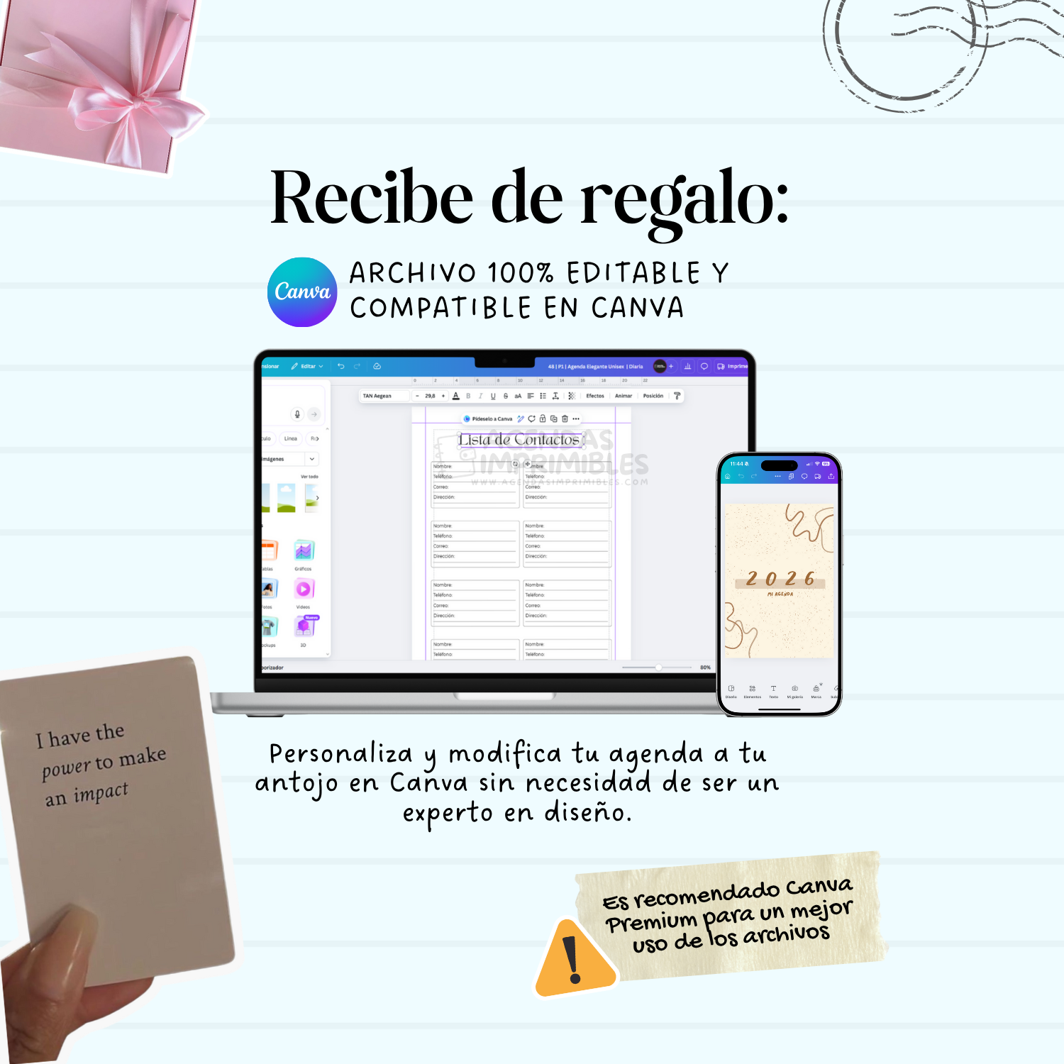 Personaliza tu agenda como más te guste: cambia textos, colores o secciones. ¡No necesitas ser experta en diseño!