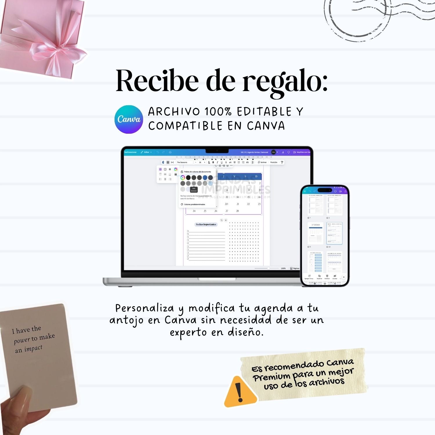 Personaliza tu agenda como más te guste: cambia textos, colores o secciones. ¡No necesitas ser experta en diseño!