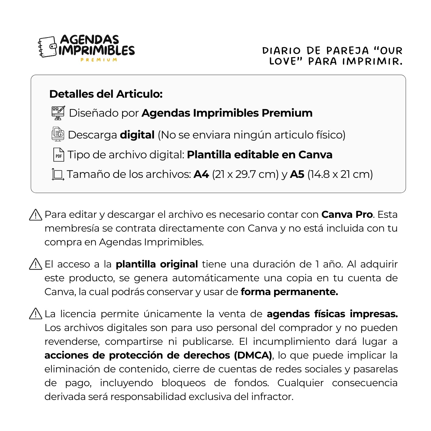 No. La licencia incluida permite únicamente la venta de agendas físicas impresas. Los archivos digitales (PDF y plantillas de Canva) son de uso exclusivo del comprador y están protegidos por derechos de autor. Somos los titulares legales de todos los diseños y contamos con sistemas de monitoreo para detectar reventa, distribución o publicación digital no autorizada. En caso de incumplimiento, se iniciará de forma inmediata un proceso formal de protección de derechos (DMCA) ante las plataformas involucradas, incluyendo marketplaces y tiendas en línea (como Shopify, Etsy, TiendaNube, Hotmart), redes sociales (como Facebook, Instagram, TikTok) y proveedores de pago (como PayPal, Stripe o Mercado Pago), lo que puede resultar en la eliminación del contenido, cierre permanente de cuentas, bloqueo de fondos y acciones legales adicionales conforme a la legislación vigente. Cualquier consecuencia derivada de estas acciones, incluyendo la suspensión o bloqueo de cuentas en plataformas digitales o servicios de pago, será responsabilidad exclusiva del infractor, y no nos hacemos responsables por pérdidas económicas, interrupciones de negocio o daños derivados de dichas sanciones. Si tienes dudas sobre el uso permitido, contáctanos antes de publicar o vender.