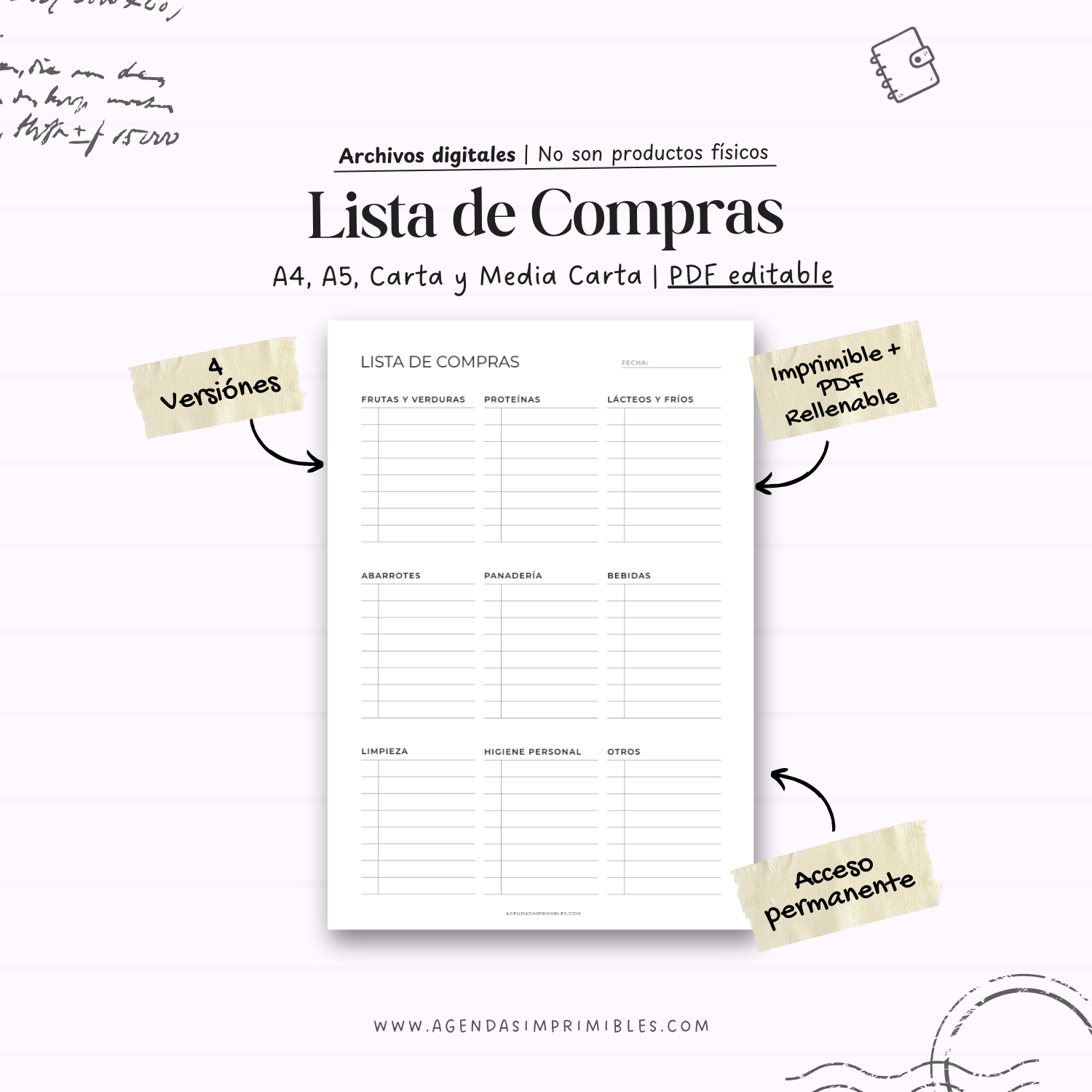 Es un diseño fijo, funcional y fácil de usar, ideal para planners, carpetas o uso independiente.