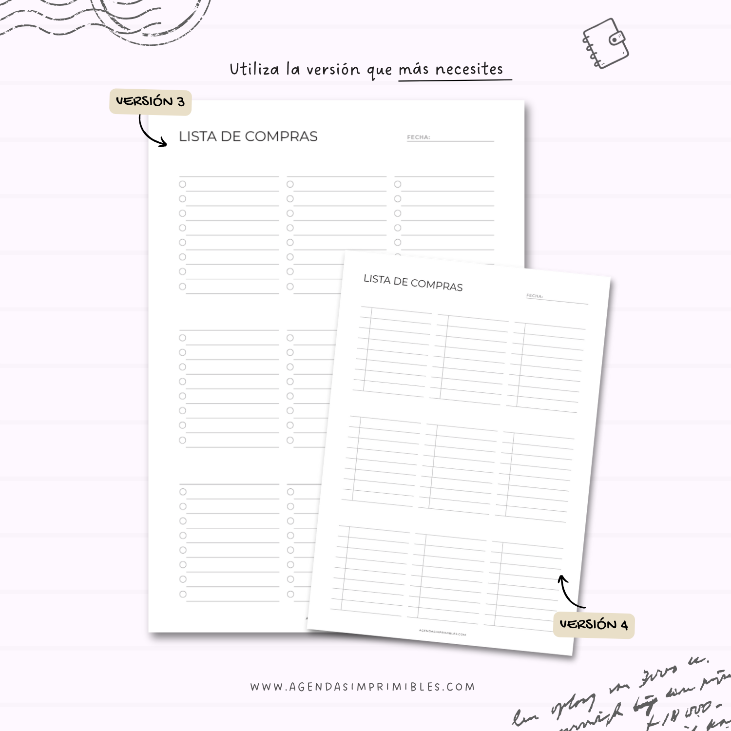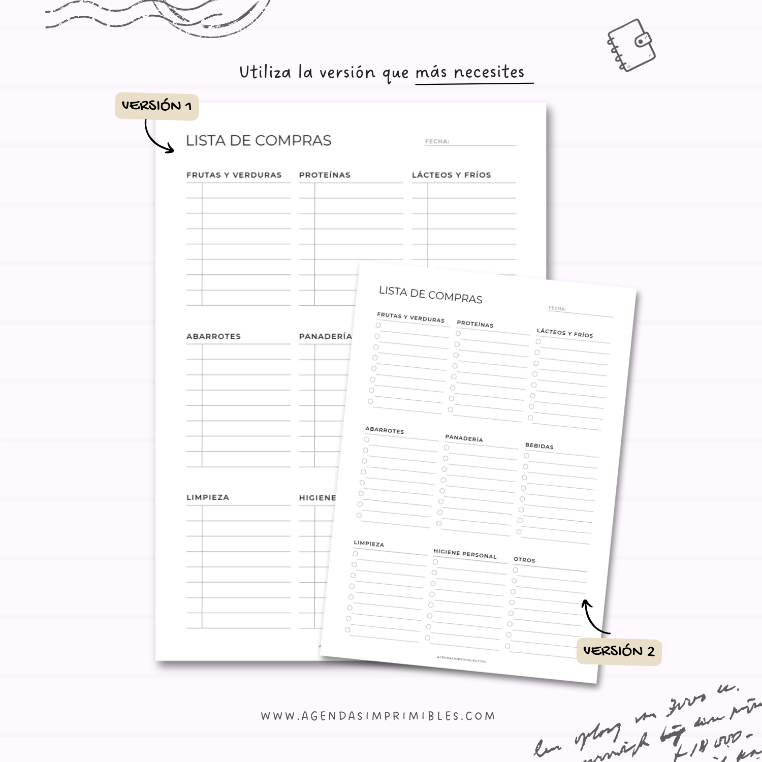 Esta Lista de Compras imprimible está pensada para facilitar tu organización diaria y hacer más eficientes tus compras. Cuenta con diferentes versiones para que elijas la que mejor se adapta a tus necesidades, ya sea por categorías, checklist o espacios libres. Descarga, imprime y úsala cuantas veces quieras.