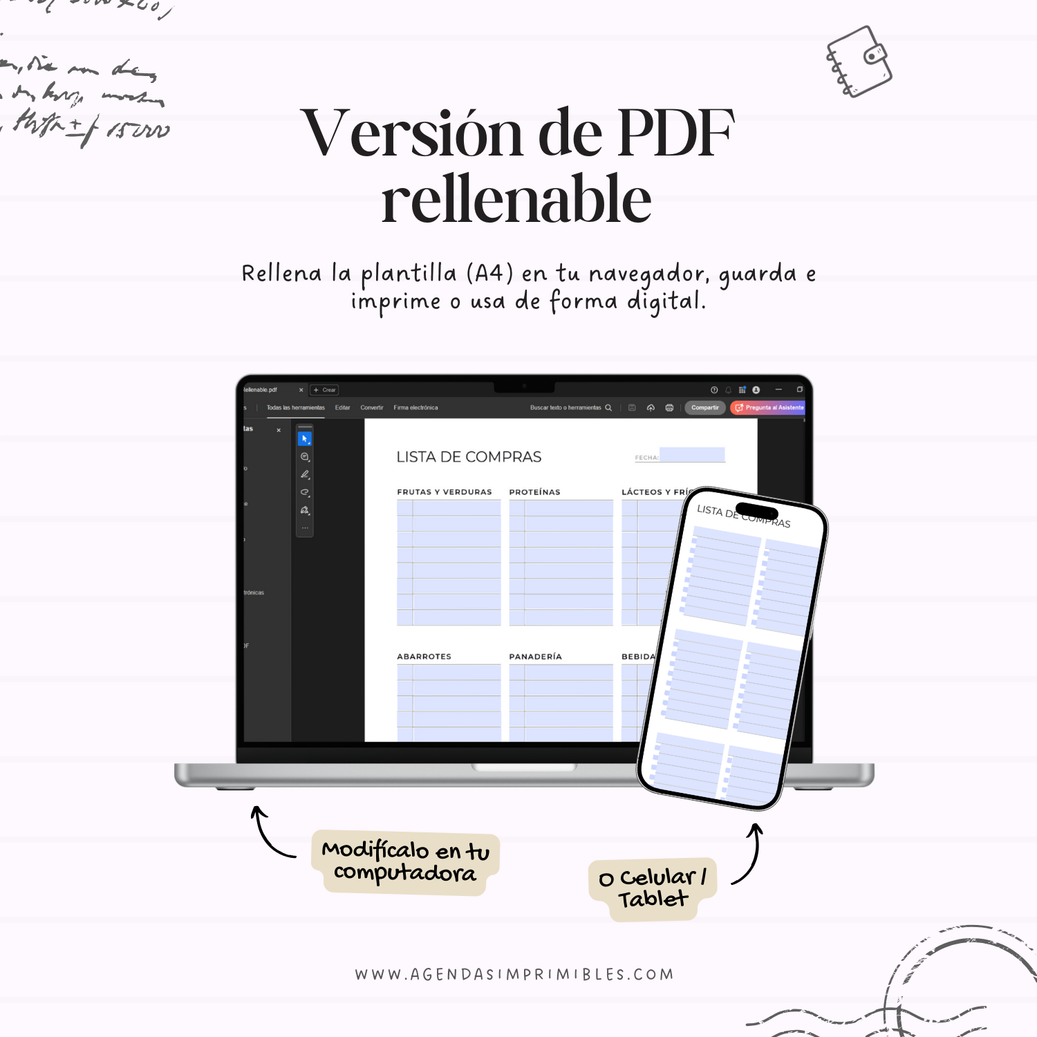 No. Los planificadores son diseños fijos, por lo que no se pueden cambiar los colores, tipografías, textos ni la estructura. Algunos diseños incluyen una versión en PDF rellenable que permite escribir directamente desde tu computadora o celular en campos predefinidos. Esta versión no permite editar el diseño, no es compatible con aplicaciones como GoodNotes o Notability y está pensada para usarse en computadora con un lector de PDF compatible.