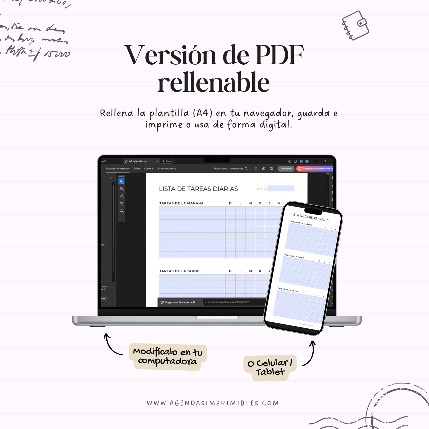 No. Los planificadores son diseños fijos, por lo que no se pueden cambiar los colores, tipografías, textos ni la estructura. Algunos diseños incluyen una versión en PDF rellenable que permite escribir directamente desde tu computadora o celular en campos predefinidos. Esta versión no permite editar el diseño, no es compatible con aplicaciones como GoodNotes o Notability y está pensada para usarse en computadora con un lector de PDF compatible.