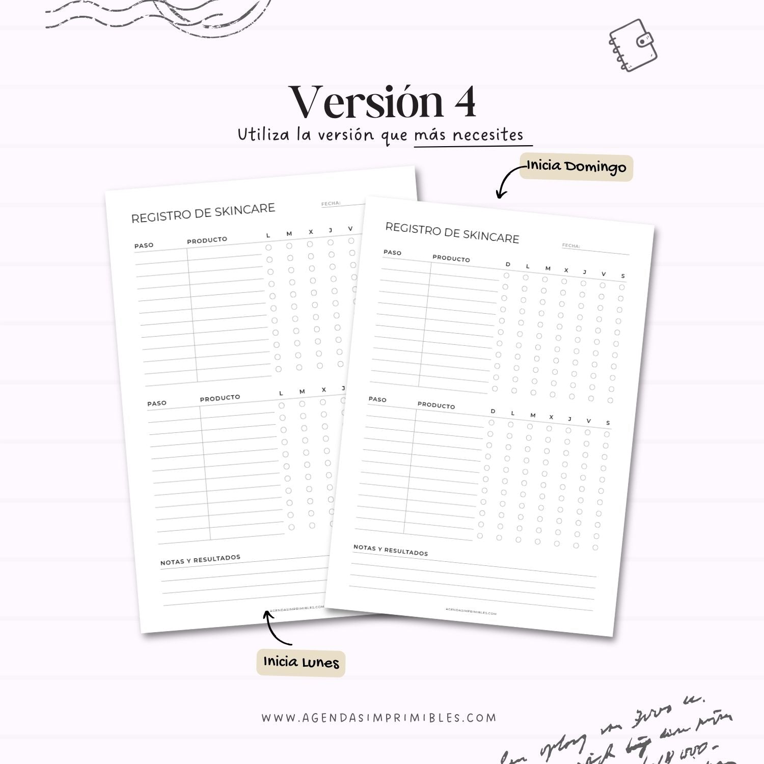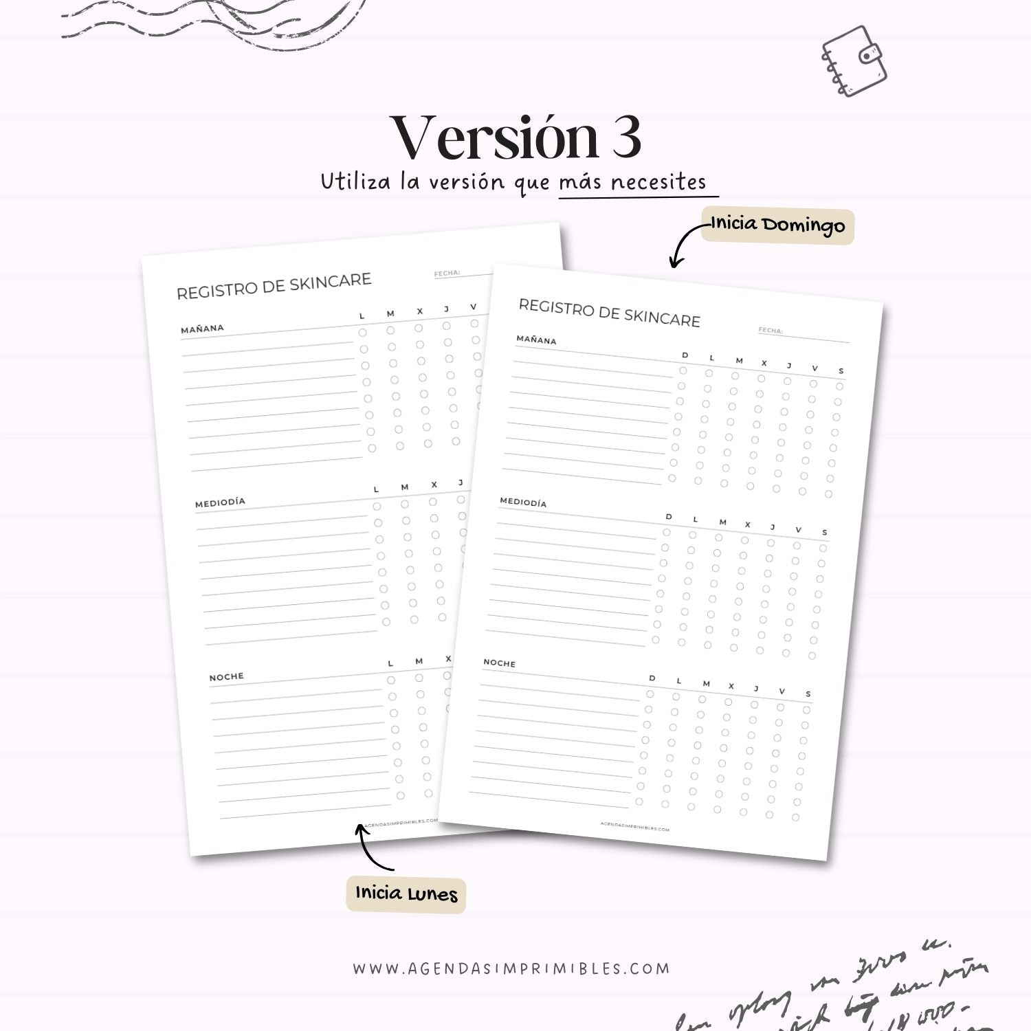Este registro de rutina skincare imprimible está diseñado para ayudarte a organizar y dar seguimiento a tu cuidado facial de forma sencilla y consistente. Incluye espacios para registrar tu rutina y marcar el seguimiento por días, con distintas versiones que se adaptan a diferentes estilos (rutina básica, rutina por momentos del día o registro por pasos y productos).