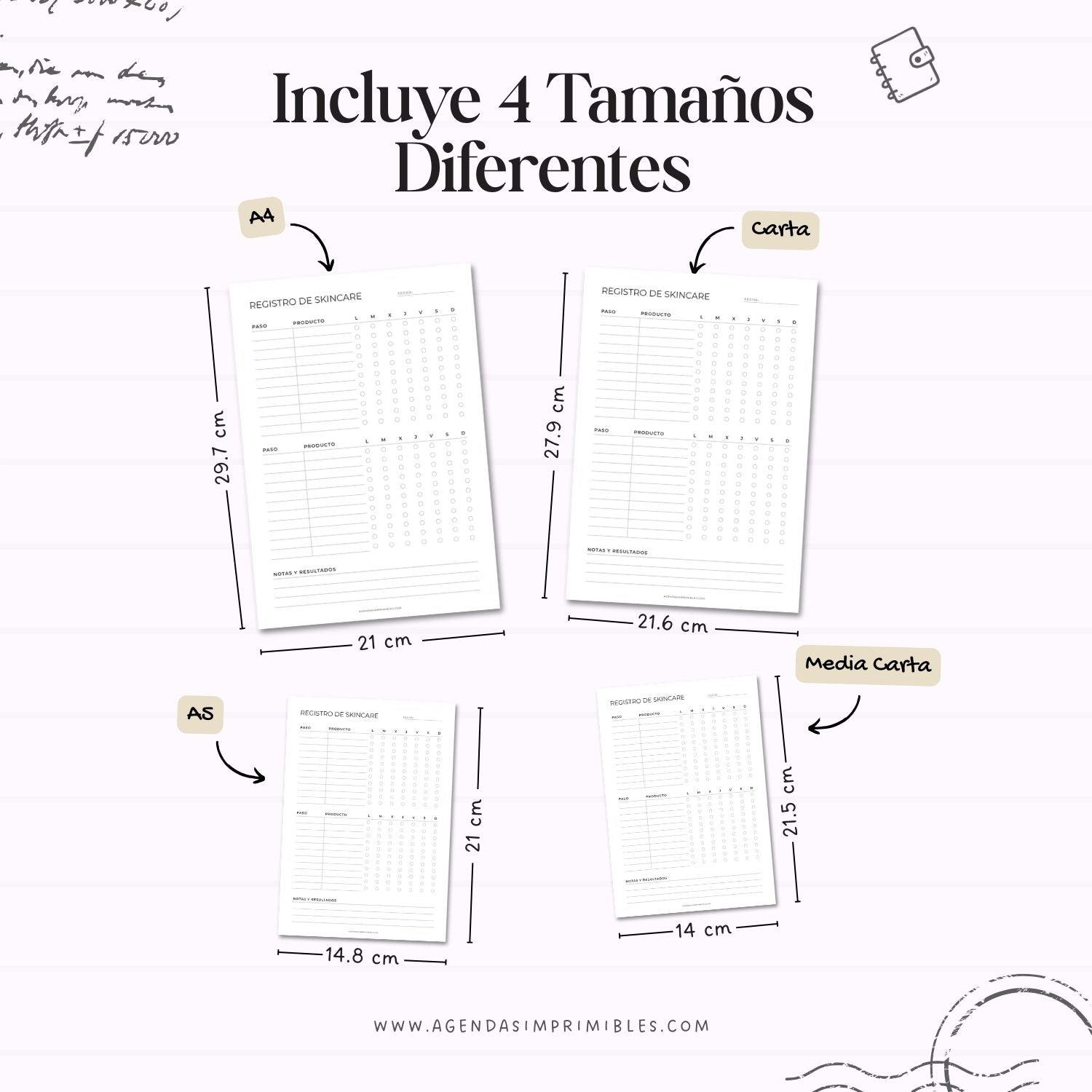 • Archivos en tamaños A4, A5, Carta, Media Carta y versión rellenable (A4).