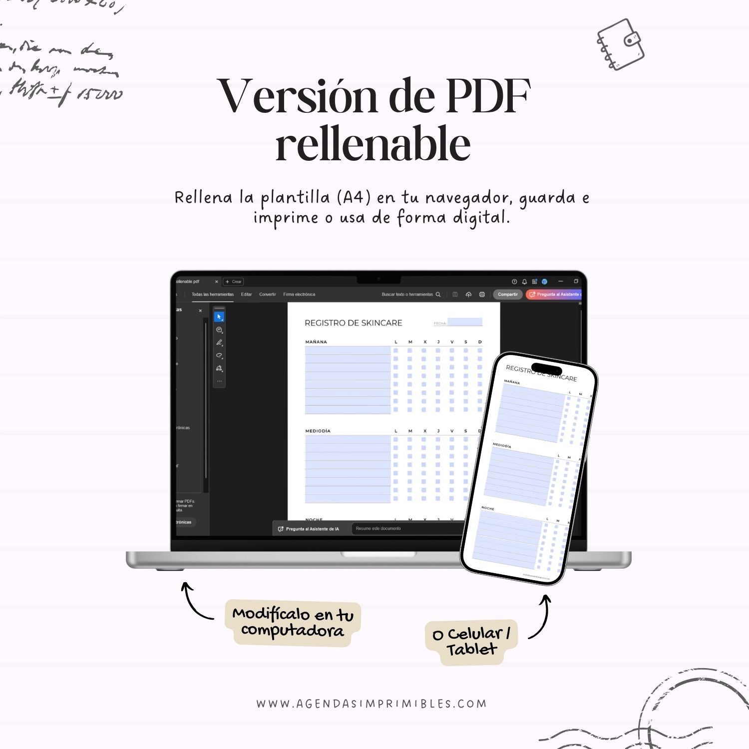 No. Los planificadores son diseños fijos, por lo que no se pueden cambiar los colores, tipografías, textos ni la estructura. Algunos diseños incluyen una versión en PDF rellenable que permite escribir directamente desde tu computadora o celular en campos predefinidos. Esta versión no permite editar el diseño, no es compatible con aplicaciones como GoodNotes o Notability y está pensada para usarse en computadora con un lector de PDF compatible.